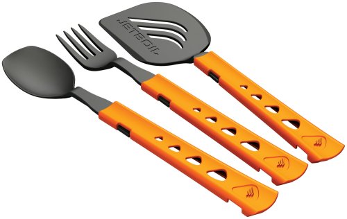 The ideal utensils for Jetboil cooking systems or meals-in-a-bag. Long enough to comfortably reach the bottom of the PCS or GCS, and specially shaped to scour each edge and corner. Spatula shape matches Jetboil FluxRing Fry Pan. Handles telescope to store compactly in or on Jetboil cooking vessels. Jetset Utensil Kit includes spoon, fork, and spatula. Lightweight and durable high-temperature nylon.